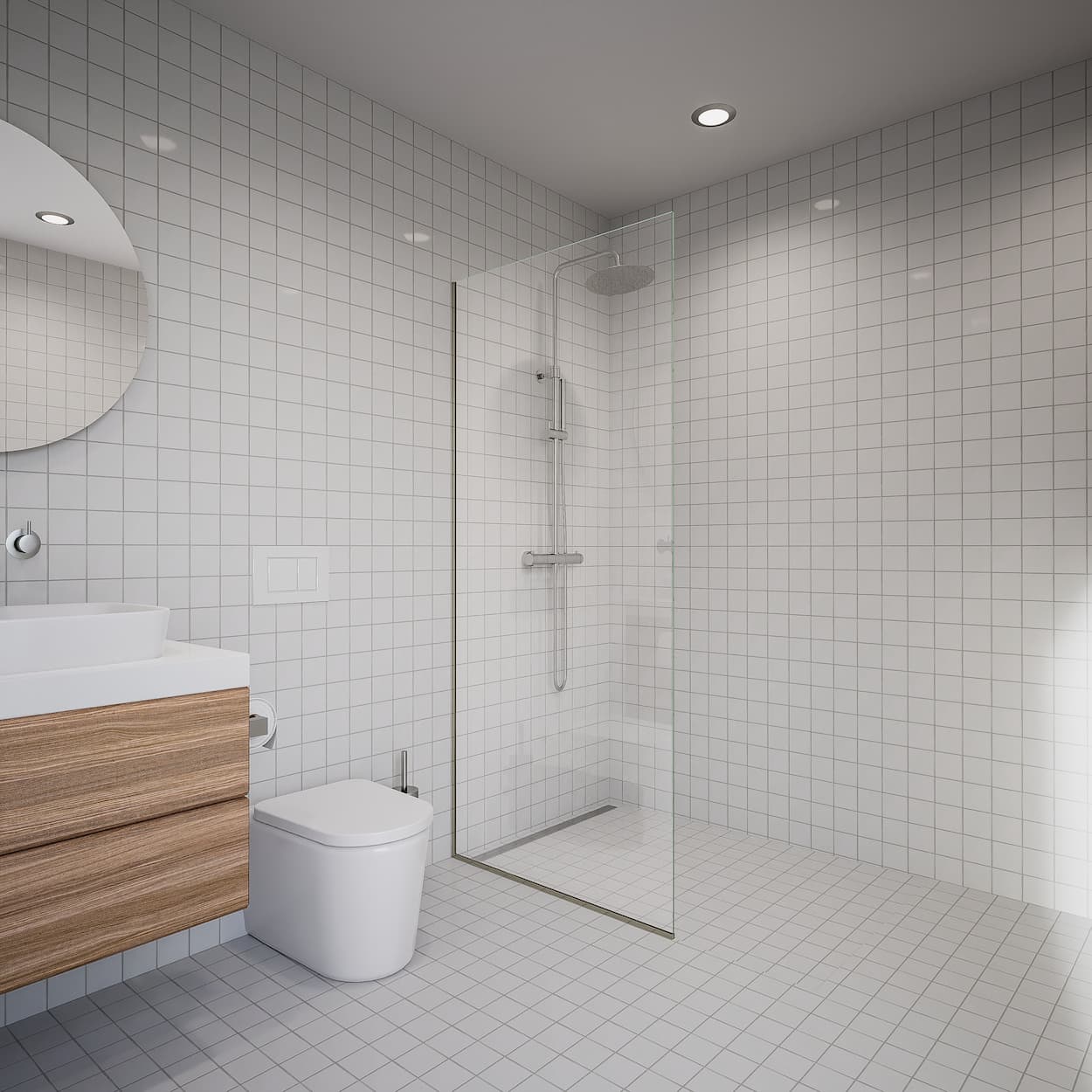 Efter monteringen af en brusevæg ændrer badeværelset sig markant. Væggen fungerer som en barriere og forhindrer vandet i at sprede sig uden for bruseområdet.